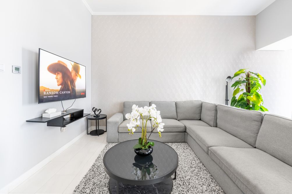 * Light-filled living area with smart TV, curated décor, and a cozy lounge setup