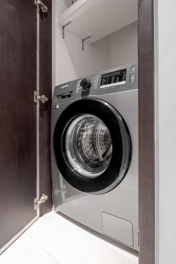 * In-unit washer, ironing board, and cleaning tools